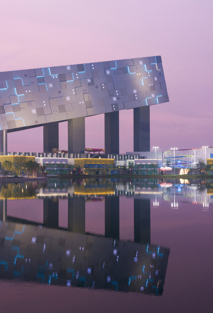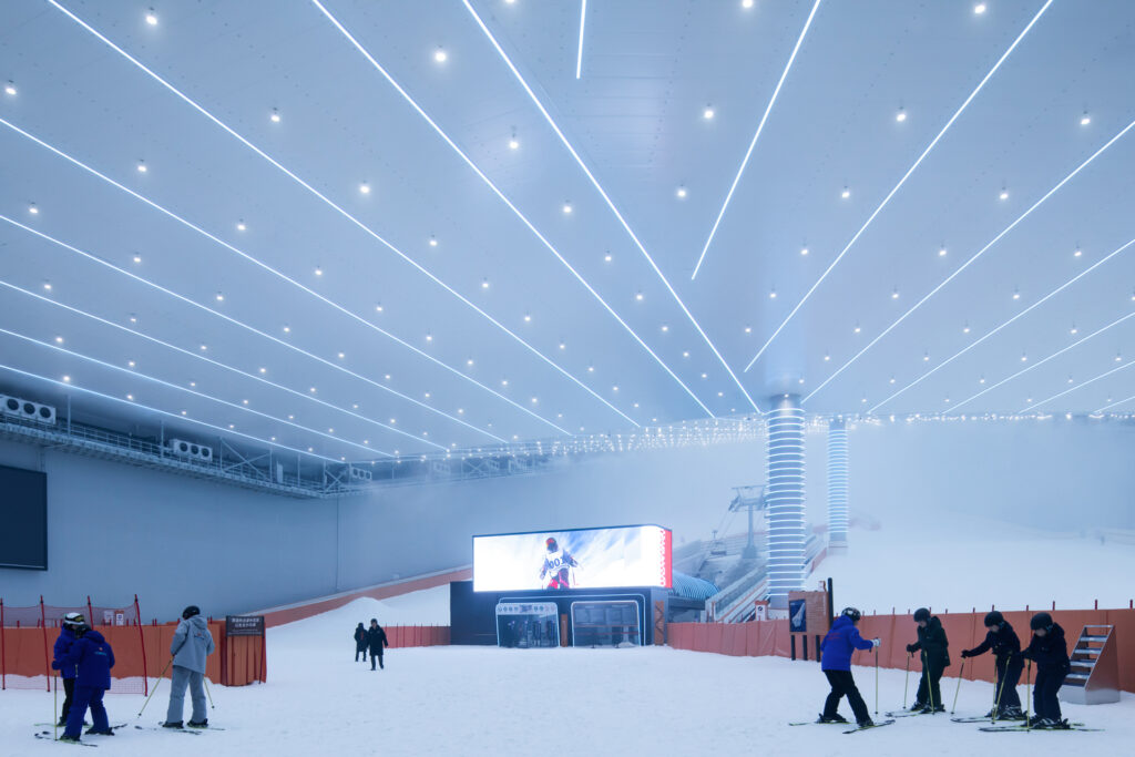 Conçu par CLOU Architects, il combine sport, loisirs, hôtellerie et culture au sein d’un univers inspiré par la glace et les reliefs montagneux. Sa silhouette, visible depuis le lac central, évoque un massif enneigé contemporain, sculpté par la lumière et la technologie.