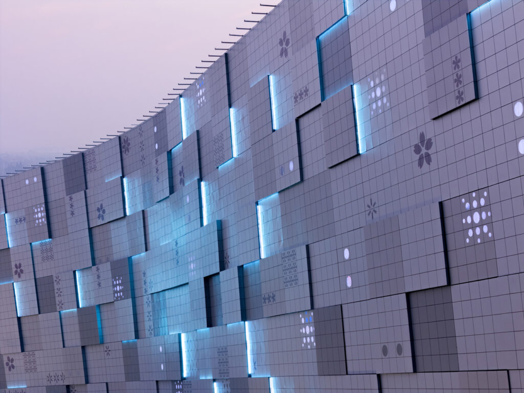 L’un des éléments emblématiques du projet réside dans sa façade multimédia “pixelisée”, composée de milliers de modules LED tridimensionnels. Ces pixels lumineux réagissent à la lumière naturelle le jour, et s’animent la nuit grâce à des scénographies colorées et dynamiques. La façade devient alors une véritable surface interactive, respirant au rythme de la ville et reflétant les variations du paysage environnant. Visible à plusieurs kilomètres, elle transforme le bâtiment en phare urbain, à la fois artistique et technologique.