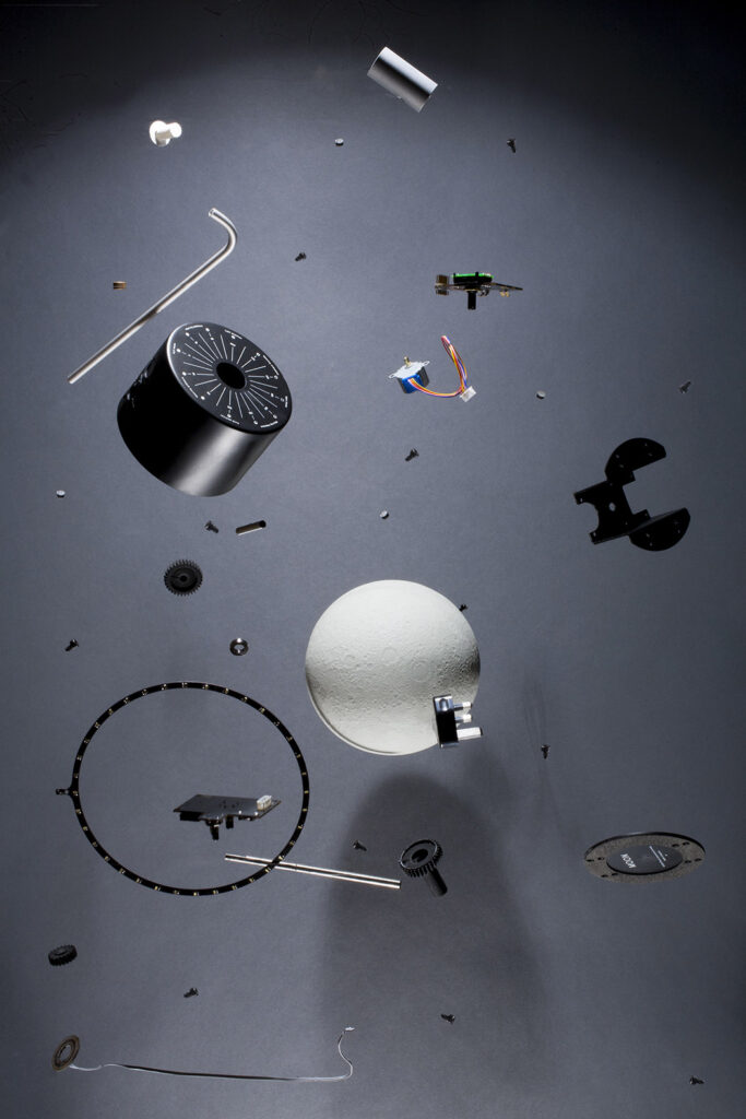 Son design repose sur un système de rotation synchronisé et un éclairage LED circulaire qui recrée les phases lunaires en temps réel, en suivant la trajectoire et la position exacte du satellite naturel autour de la Terre. Chaque rayon lumineux simule le mouvement du soleil sur la surface lunaire, offrant une visualisation précise et apaisante du cycle lunaire.