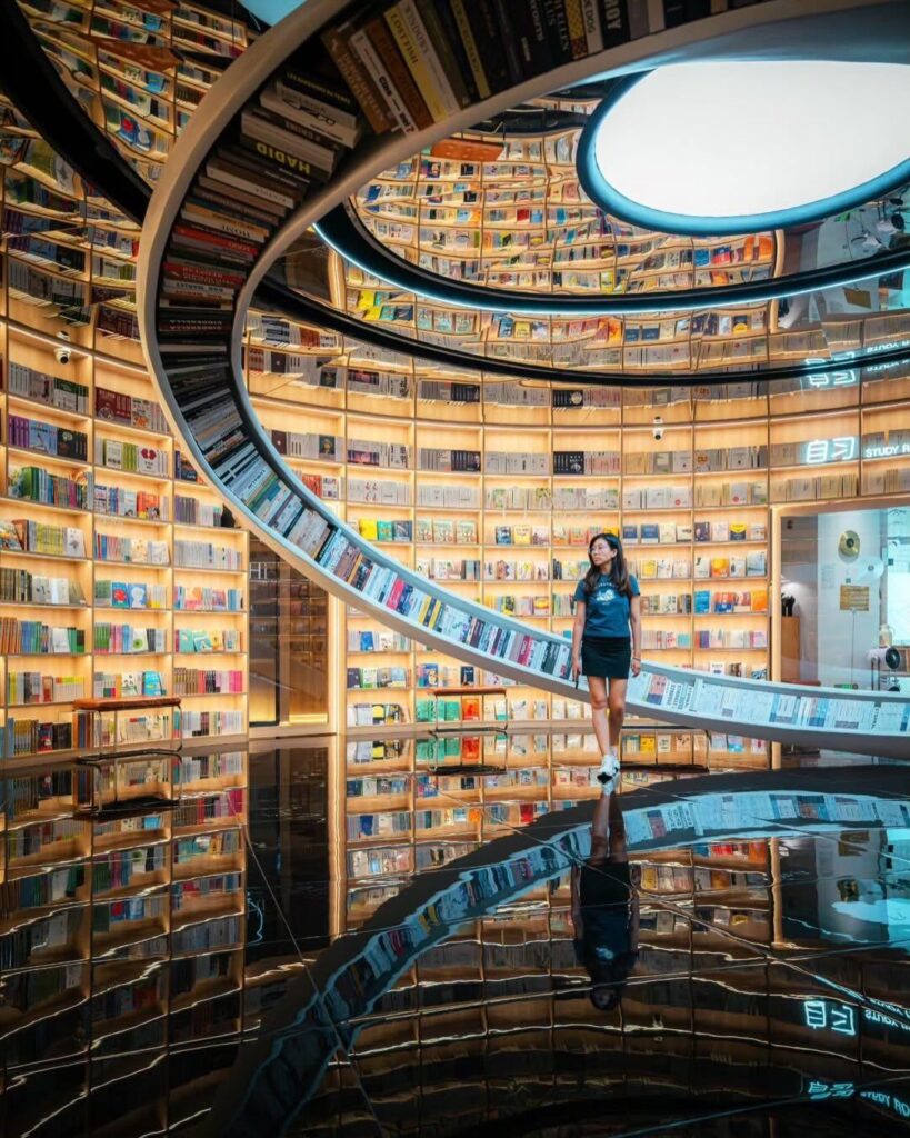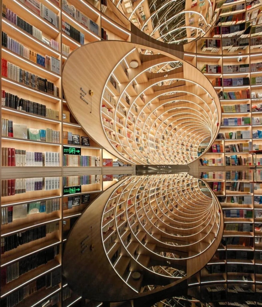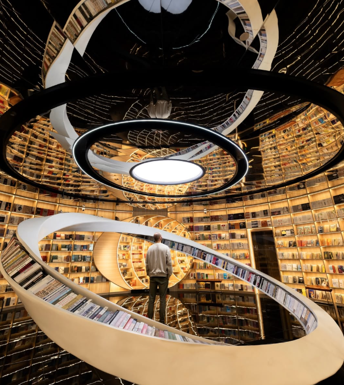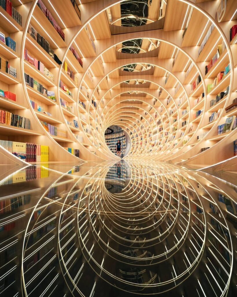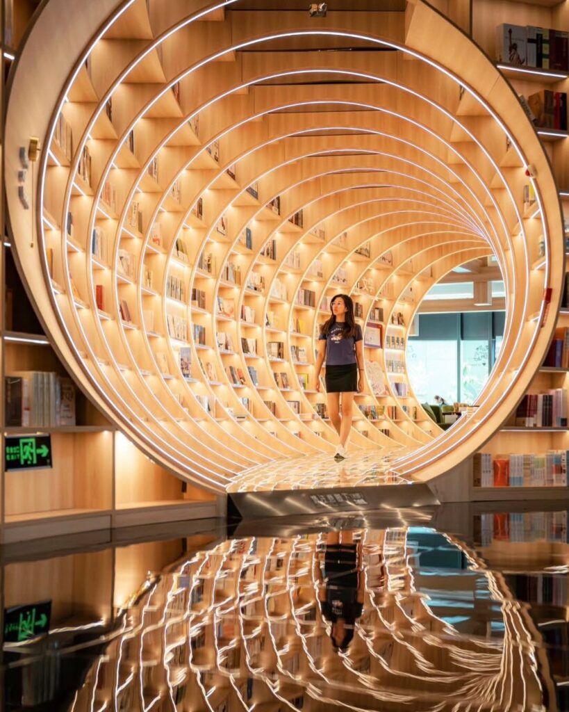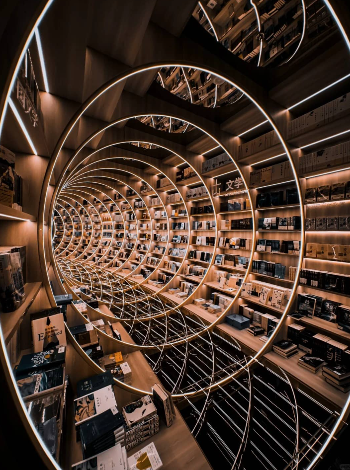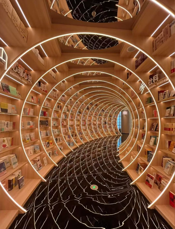 Au-delà de son architecture spectaculaire, Yuxin Bookstore de Shenzhen doit une grande partie de son impact visuel à l’intégration fine de la technologie LED. La lumière ne se contente pas d’éclairer l’espace, elle en devient un élément structurant. Les lignes lumineuses accompagnent les courbes du lieu, soulignent les perspectives et accentuent les effets d’infini créés par les miroirs.