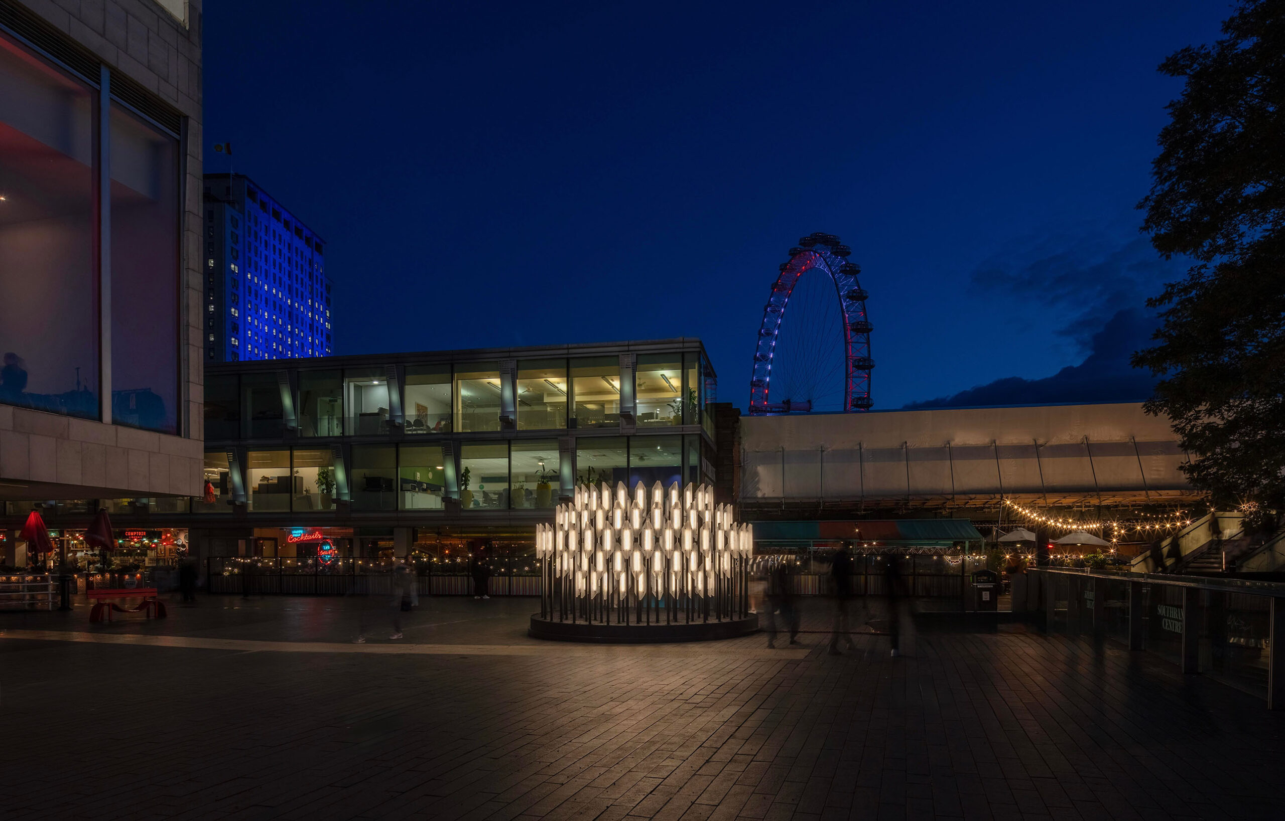 Son design noir, ses lanternes de verre et sa pulsation lumineuse s’intègrent harmonieusement dans le contexte architectural brutaliste environnant, des bâtiments comme le Hayward Gallery ou la façade du Festival Hall.